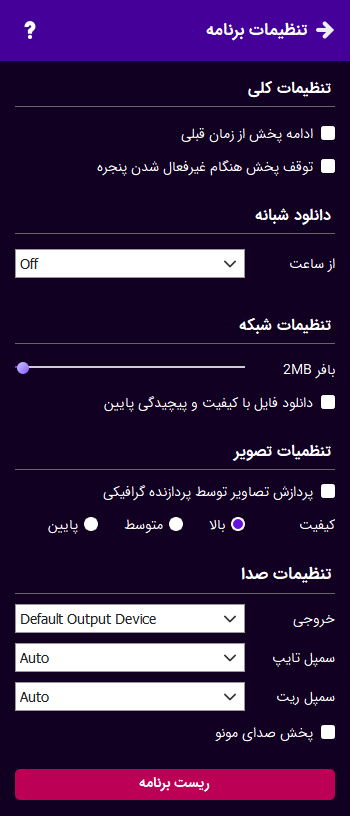 با انتخاب این گزینه دیتابیس برنامه حذف شده و برنامه ریستارت میشود. ریست برنامه باعث حذف فایل های دانلود شده نمیشود.